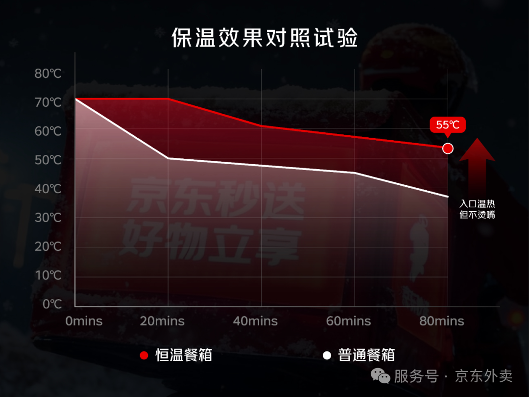 即使是60分钟以上的超远距离配送,餐箱温度仍能保持在55℃以上。