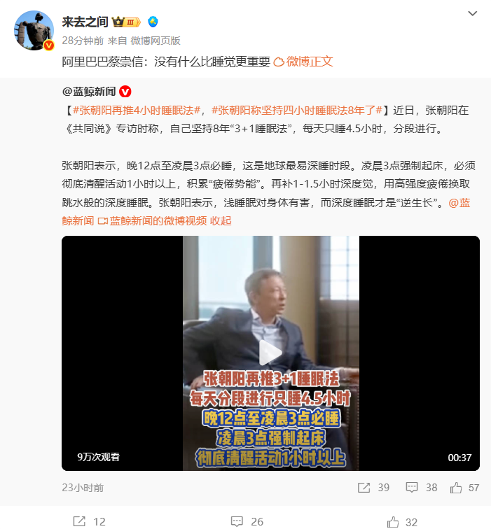 今日,微博CEO转发阿里巴巴蔡崇信视频,并引用其原话:“没有什么比睡觉更重要”。蔡崇信称,自己以前把锻炼看得比睡觉重要,经常每天睡觉3-4个小时,早上6点就去公司健身房。然而现在他认为,睡觉才是最重要的,并推荐了一本名为《你为什么要睡觉》的书,上面提到99%的人,每天至少要睡眠7-8小时。