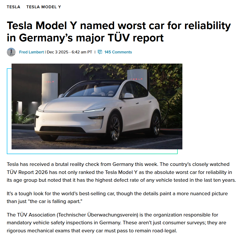 据electrek报道,近日,德国强制车辆安全检验的机构TÜV协会发布2026年度报告。报告不仅将特斯拉Model Y评为同车龄段可靠性最差的汽车,还指出它在过去十年中测试的所有车辆中,拥有最高的缺陷率。