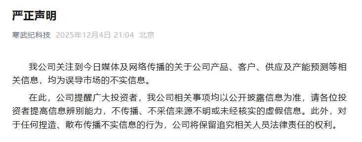 寒武纪表示,公司关注到今日媒体及网络传播的关于公司产品、客户、供应及产能预测等相关信息,均为误导市场的不实信息。