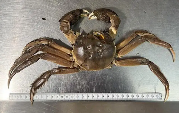 经确认,这是一只雄性中华绒螯蟹(俗称大闸蟹),系美国太平洋西北地区首次官方记录到这种高度入侵物种。