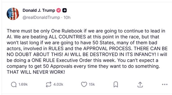 美国AI行业此前一直呼吁建立统一的联邦监管框架,从而结束各州分头立法的现状。
