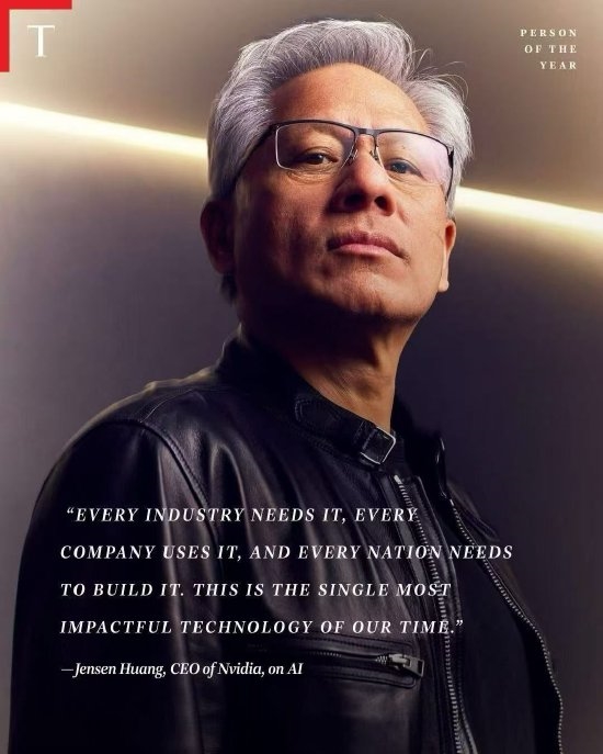 黄仁勋认为AI将使全球GDP增长五倍:“每个国家都需要打造它。”当地时间12月11日,美国《时代》杂志官宣,“AI的缔造者”当选2025年度人物。其中,8位AI行业的领导者登上了杂志封面。