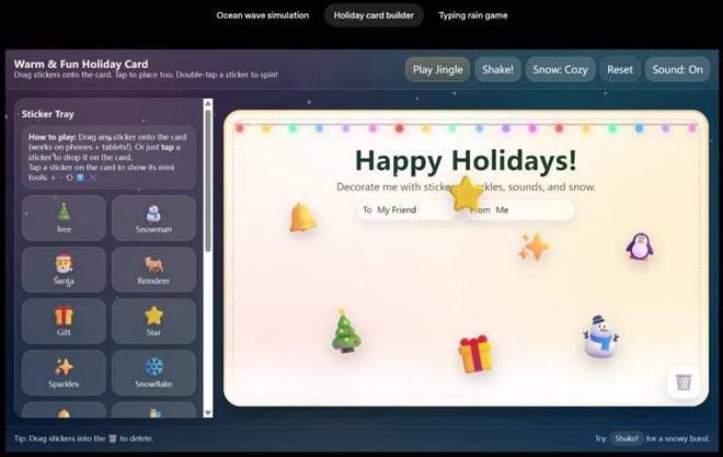 GPT-5.2 Thinking 在前端工程能力上也优于 GPT-5.1 Thinking。早期测试者发现,它在前端开发以及复杂或非常规的 UI 设计(尤其是包含 3D 元素 的界面)方面的能力显著增强,使其成为全栈工程师的强大日常助手。