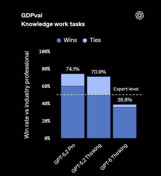 GPT-5.2 在 GDPval(知识工作)基准上的分数为 74.1%,OpenAI 声称这是 AI 模型首次达到了“人类专家水平”。