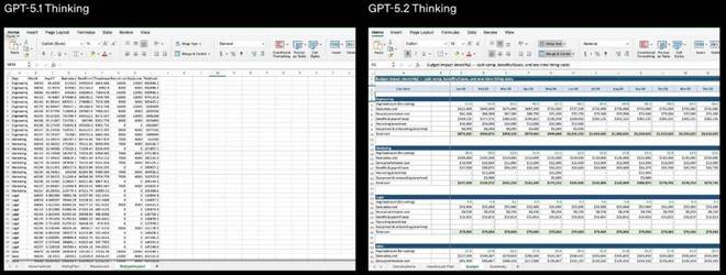 对比显示,GPT-5.2 Thinking 在生成电子表格与演示文稿时,在专业度与排版质量上都有显著提升: