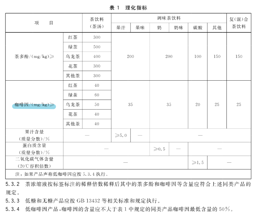 目前,奶茶们适用的现行国标《 茶饮料 》,已经是 2008 年出台的。里面只对这些茶饮的咖啡因下限做了规定,咖啡因含量要达到 35mg/kg 以上。简单来说,只防你偷工减料,不怕你“ 良心 ”大发。就算霸王茶姬们咖啡因加加加加到厌倦,也并不违规。