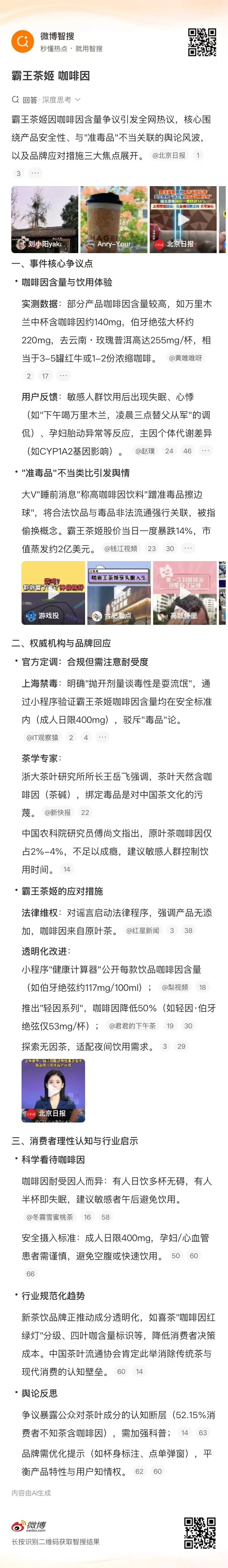 再加上准毒品的噱头,茶饮品牌直接住热搜上下不来了。吓得霸王茶姬赶紧连夜发声明,各种自证清白。说什么自己的咖啡因是茶叶里来的,中国人早就在喝茶叶了。