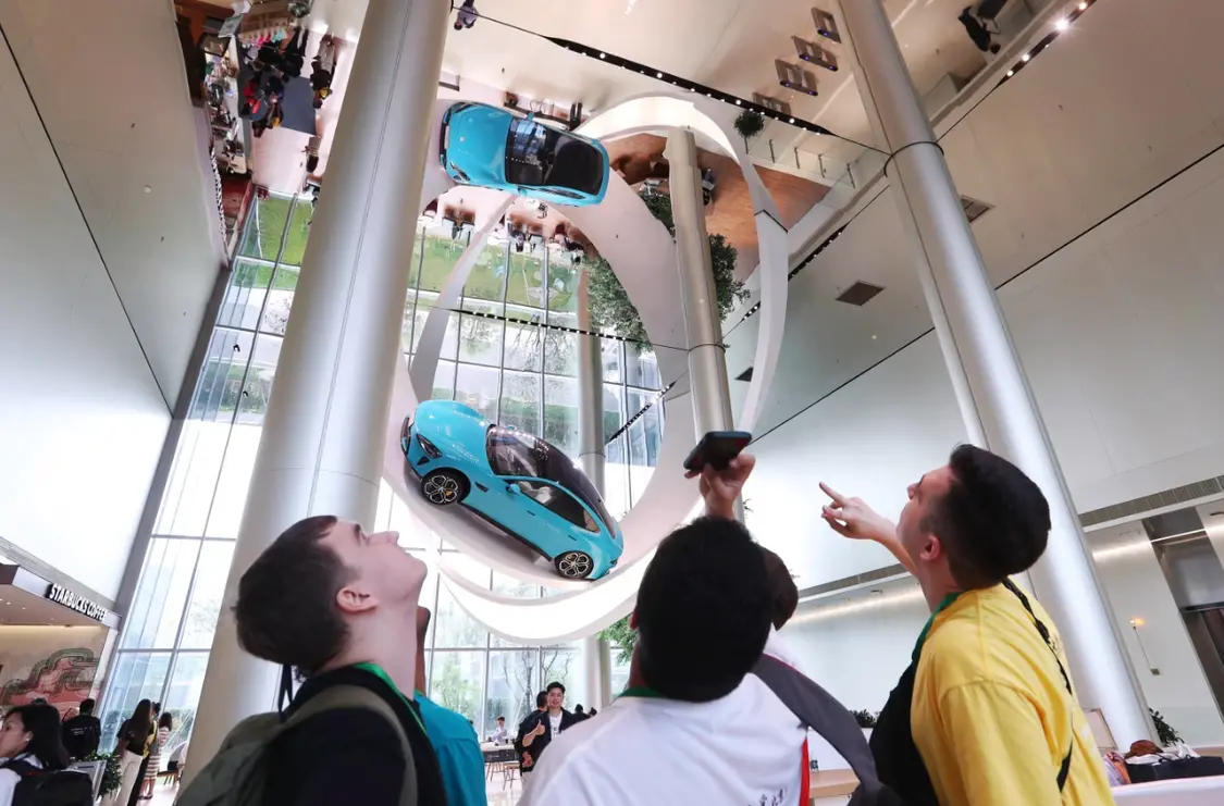 还有人专程只为在展厅大堂拍照,那里有辆蓝色小米SU7悬挂在镜面天花板的莫比乌斯环装置上,已成为“打卡”热点。在中国,“打卡”指游客专门前往某地拍照并上传社交媒体,以获取数字影响力的现象。