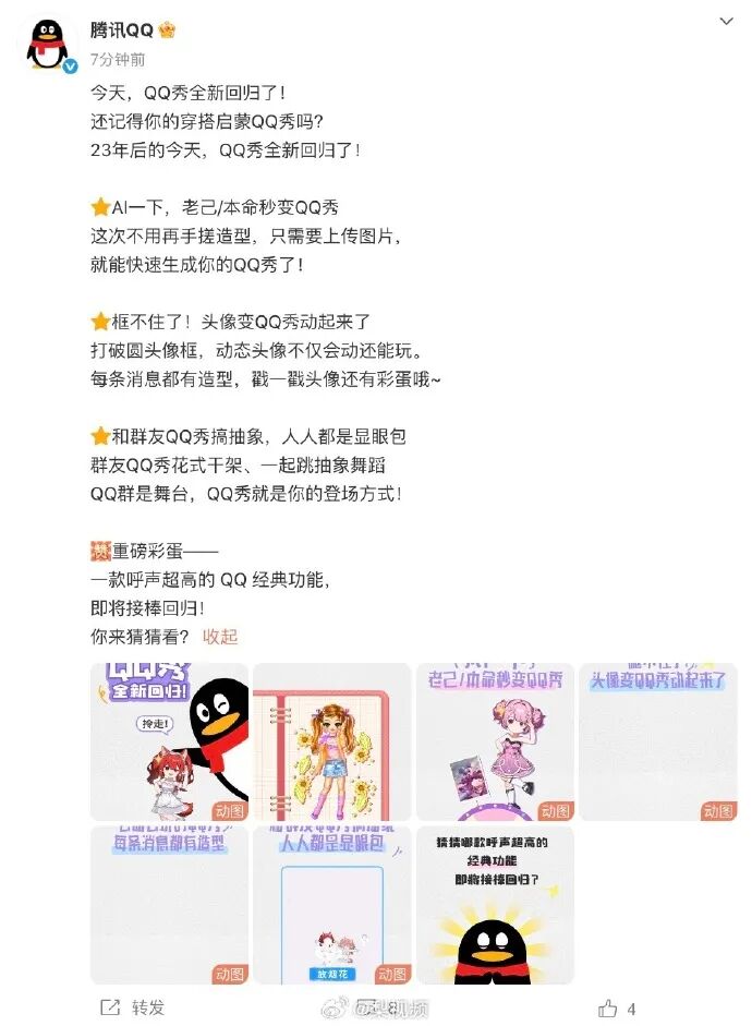 腾讯QQ宣布,承载一代用户青春记忆的QQ秀全新回归,用户在手机QQ搜索“QQ秀”即可体验。据悉,此次焕新回归的QQ秀,是QQ在AI时代下对社交场景的一次全新探索,通过AI驱动生成虚拟形象,并深度融入核心聊天场景,为用户提供更高效、生动的个性化表达和互动方式。