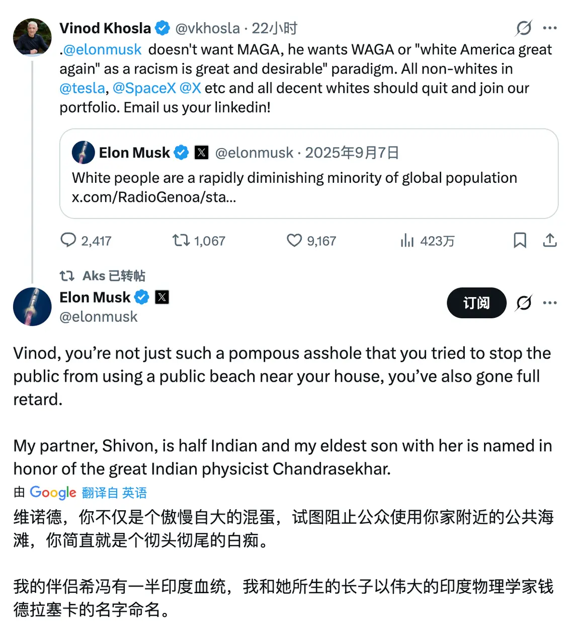 “维诺德,你不仅是个自大的混蛋,曾试图阻止公众使用你家附近的公共海滩,还是个弱智。我的伴侣希冯是半印度血统,我和她的长子命名时还致敬了伟大的印度物理学家钱德拉塞卡。”马斯克称。