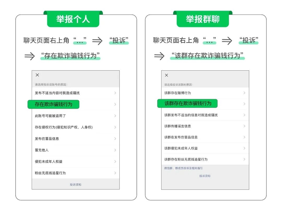 如果发现聊天的对方或者群聊存在欺诈骗钱等异常行为,立刻举报。