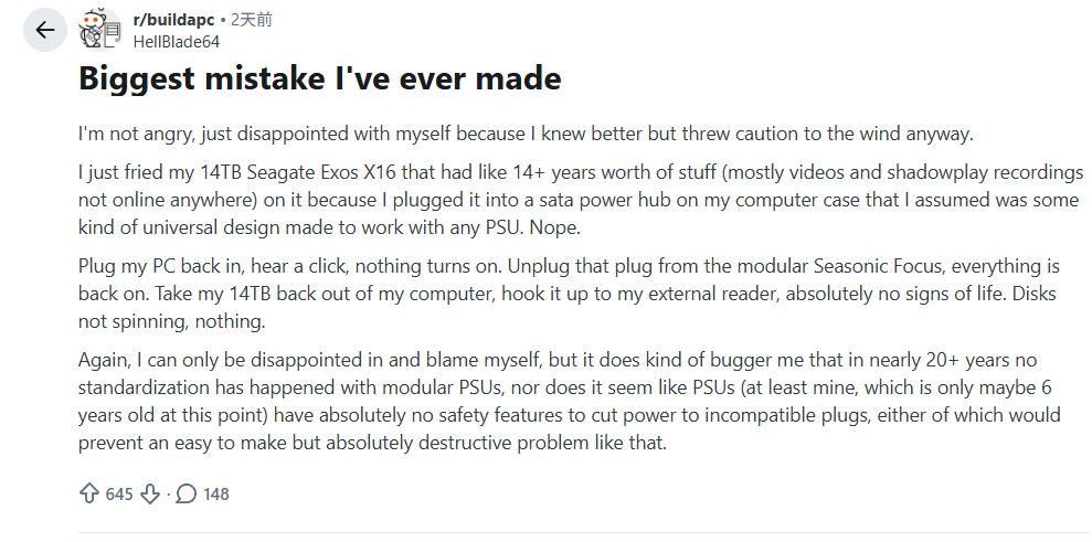 14年多的数据没了,硬盘也无法启动了。近日,Reddit论坛PC板块的一则帖子引发了广泛关注。用户HellBlade64 分享了自己的惨痛经历,因误插一根非标配的电源线,瞬间烧毁了一块存储着14年数据的14TB希捷Exos X16硬盘,所有未备份的视频和Shadowplay录制的游戏录像等珍贵资料全部丢失。