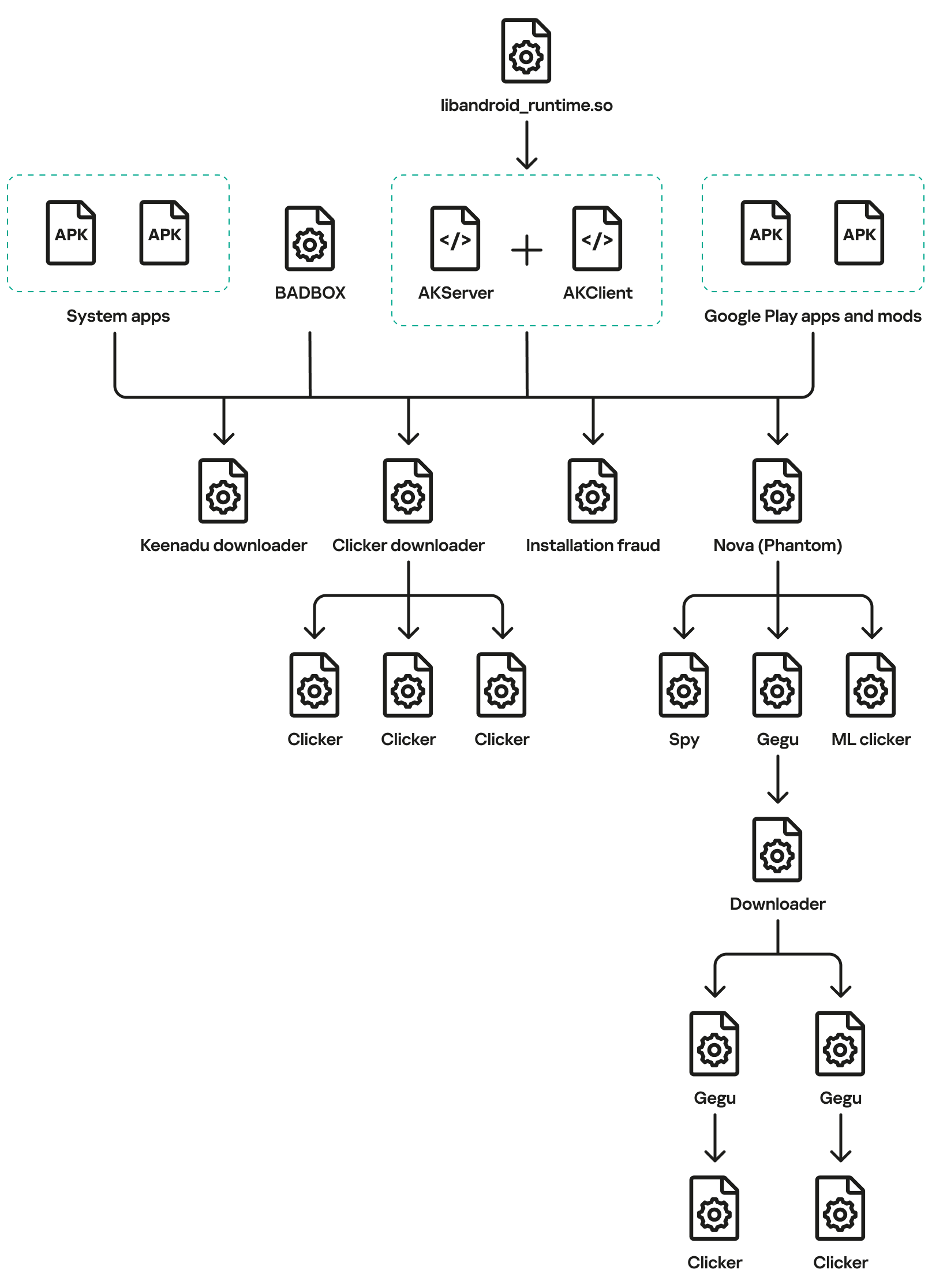 该后门采用多阶段架构,操作者可对被感染设备进行远程“几乎不受限制”的控制,并可下发不同恶意载荷执行多类任务 。在已观察到的能力中,载荷可针对浏览器搜索引擎进行篡改,借由推动新应用安装实现变现,进行更隐蔽的广告交互等,同时研究人员还发现其踪迹曾出现在通过 Google Play、小米 GetApps 以及第三方应用仓库分发的应用中 。