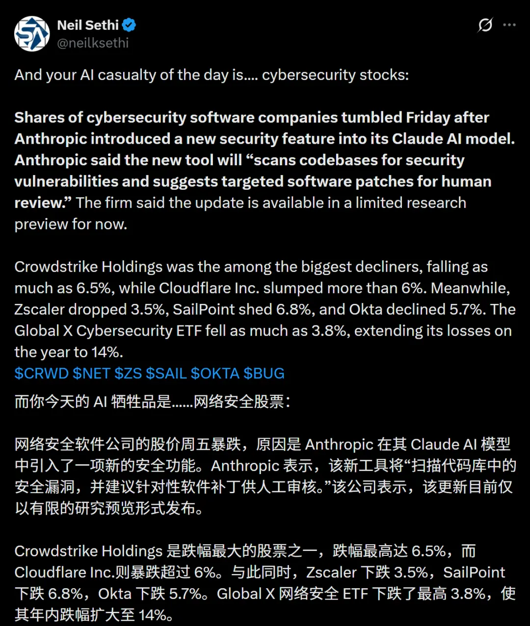 外媒火速发文:网络安全公司的股价周五暴跌,原因仅仅是因为,Anthropic在Claude新模型中引入一项安全功能