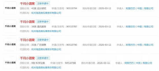 在企查查官方网站看到,阿里“千问小酒窝”商标涵盖第9类(科学仪器)、第35类(广告销售)、第38类(通讯服务)以及第42类(设计研究)共 4 个国际商标分类。其中,已申请项目包括人工智能即服务(AIaaS)、模拟对话用聊天机器人软件、科学研究用具有人工智能的人形机器人、辅助人类和供人娱乐用具有交流和学习功能的类人机器人等,目前商标状态均为“注册申请中”。