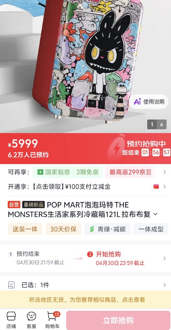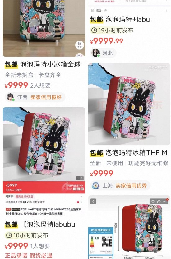 在抢购热潮下,原价5999元的泡泡玛特LABUBU冰箱,二手交易价格已达到9999元,溢价4000元。