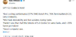 OpenAI首席执行官Sam Altman宣布:“GPT-5.3-Codex正式发布!编程性能再攀新高:SWE-Bench Pro评测达57%、TerminalBench 2.0达76%、OSWorld达64%;支持任务中实时调控与动态更新;运行效率跃升:完成同等任务,令牌消耗量较5.2-Codex减少超一半,单令牌处理速度提升超25%;具备成熟的计算机实操能力。”