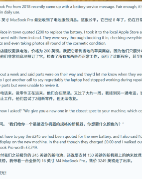 苹果的M4 Max芯片无疑是当前最强大的芯片之一,搭载此芯片的的MacBook Pro 16在京东上最低售价也要27999元。但令人没想到的是,近日一位2018款MacBook Pro的主人在寻求电池更换服务时,竟阴差阳错地获赠了一台最新款16英寸M4 Max MacBook Pro。