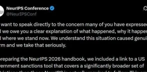 今天下午,AI三大顶会之一NeurIPS官方在X平台发布声明,就此前引发轩然大波的制裁合规条款正式致歉。声明称,在编写NeurIPS 2026手册的过程中,NeurIPS加入了一个美国政府制裁查询工具的链接,其覆盖范围远超NeurIPS实际需要遵守的限制,系基金会与法律团队之间的沟通失误,从未有意将参与限制扩大到强制合规义务之外。